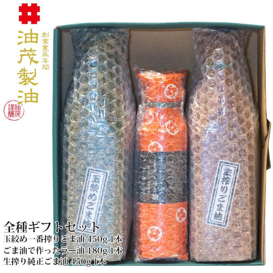 油茂製油の玉締め一番搾り・生搾り純正ごま油・ラー油 セット内容が選べるギフトセット